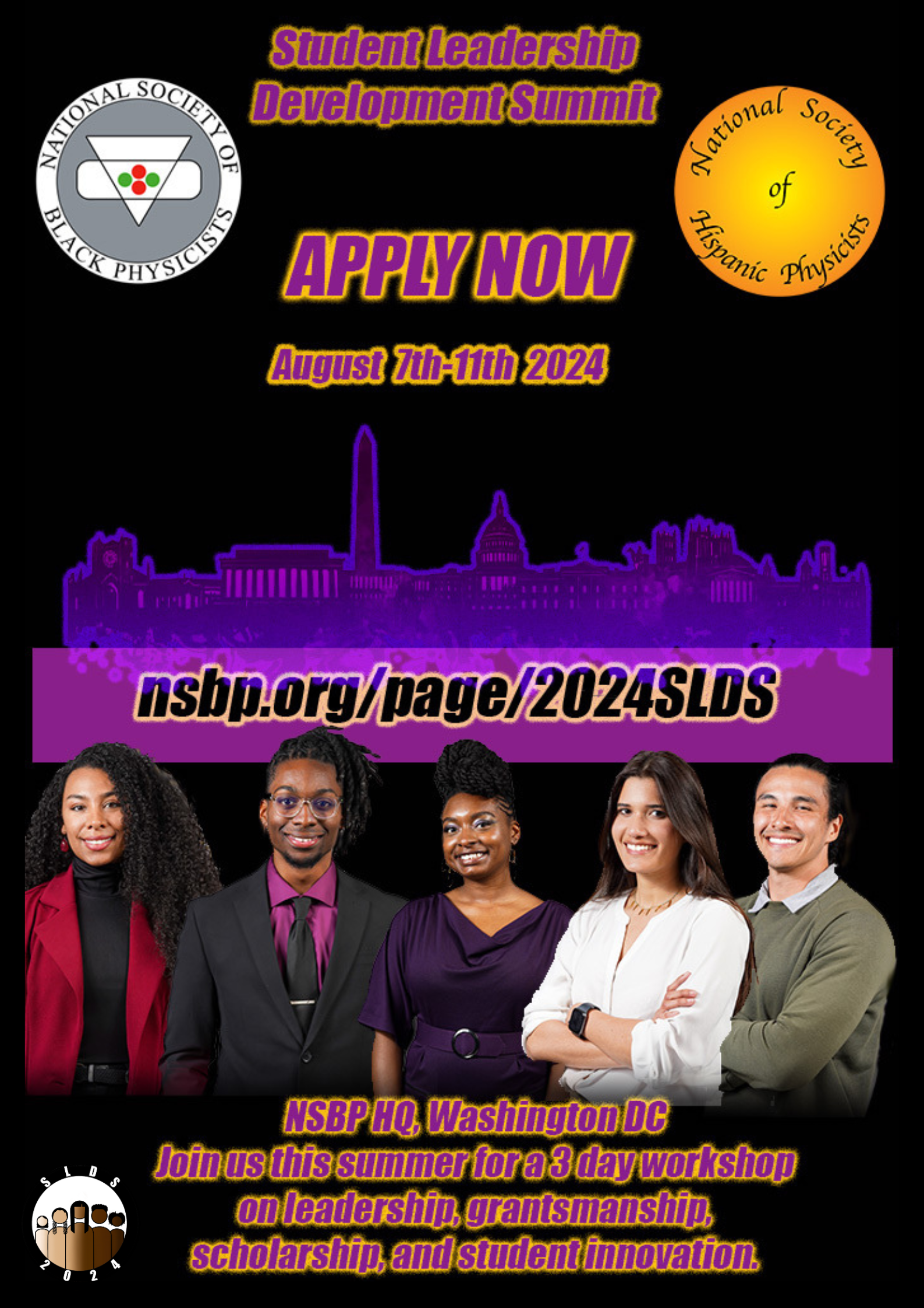 The National Society of Hispanic Physicists (NSHP) and the National Society of Black Physicists (NSBP) are hosting the second annual Student Leadership Development Summit in Washington DC from August 7th to 11th. This event includes workshops, panels, and talks that engage students in leadership and professional development, including grantsmanship, science communication, and more. Applications close in two weeks so please applyif this sounds interesting to you! There is a $100 registration fee, and travel and lodging will be provided for selected attendees.